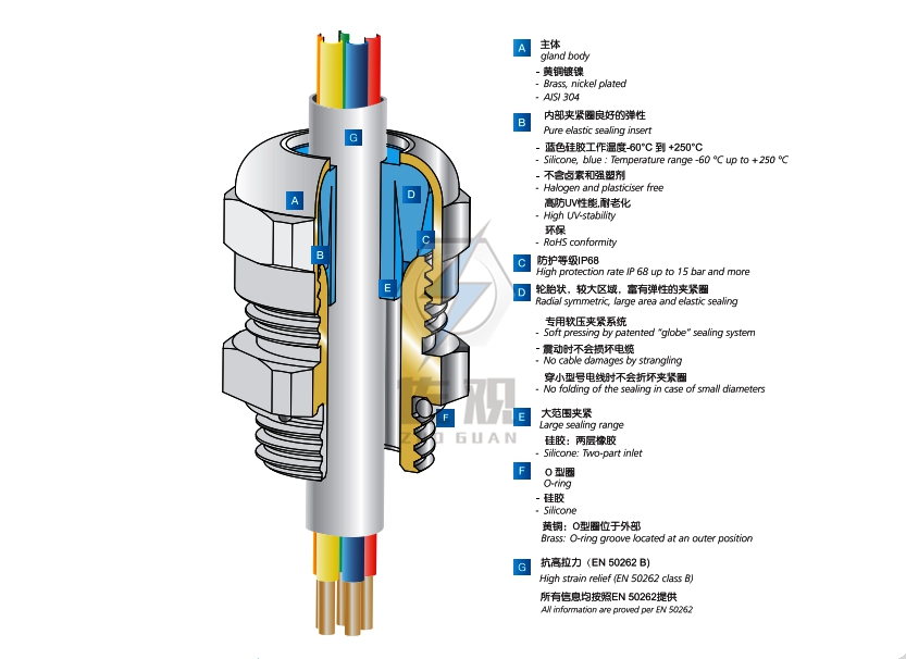 产品特点 : 使用特殊夹紧爪与夹紧圈设计,夹紧电缆范围大,抗拉力特强,完全遵从严格的安规设计外,其材质性能亦得以抵抗多种化学物质,溶剂,油气及机油等所造成的侵蚀.