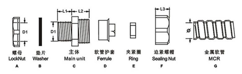 产品材质: A.C.F部位采用优质加厚型锌合金制成、B.E部分采用丁腈橡胶制成、D为铁皮制成。