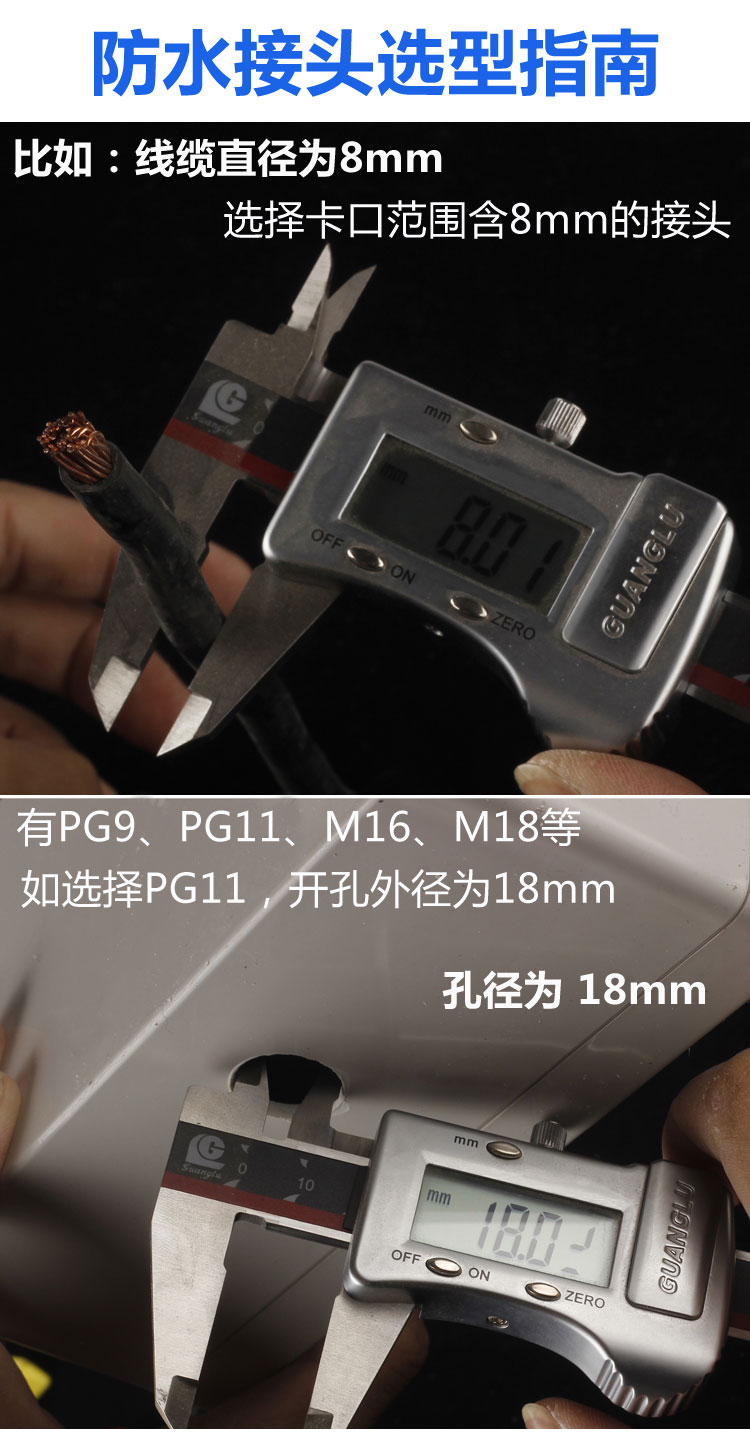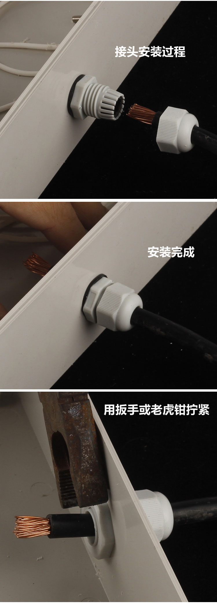 尼龙格兰头适合于电源进线、仪表、照明灯具、LED灯具、电气箱等一切要求整体或部分达到防水防尘,抗拉等要求的场合,是一种用于紧固电线电缆,并达到一定的IP防护等级和抗拉、抗扭能力的产品。根据材质的分类电缆接头的主体采用UL认可的尼龙PA66 94V-2等级材料,橡胶圈为丁腈橡胶材质,可使得产品达到IP68防护等级。 螺纹规格:按照国际标准,电缆防水接头可分为 公制(Metric)、德制(PG)、英制(G)、美制(NPT)、管制(MG) 工作温度:尼龙接头在正常状态下静态-40°C至100°C,瞬时耐热至120°C,动态-20°C至80°C,瞬时耐热至100°C。 产品特性:M18X1.5尼龙电缆防水接头采用特殊夹紧爪与橡胶件设计,夹紧范围大,抗拉力特强,可防水,防尘,防盐,耐酸碱,酒精,油脂及一般溶剂。 颜色种类:黑色、灰白色,特殊颜色(绿色、红色、蓝色、黄色)可定做。 产品认证:通过权威部门的检测电缆防水接头产品获得了CE、IP68(防尘、防水测试合格)、ROHS(环保)、TUV、CTS等认证 产品特性: ①尼龙电缆格兰头加紧圈经特殊设计,固定拉力强,对电机不造成伤害 ②尼龙电缆密封格兰头的固定头解体,电缆可直接穿入上紧即可,省时方便 ③尼龙电缆密封格兰头具有防水,防尘、盐、耐弱酸、酒精、油、油脂及一般溶剂,室内室外均可应用 ④尼龙电缆密封格兰头在规定的卡口范围内,并使用O形密封圈旋紧迫紧头,达到IP68 防护等级 应用范围: 尼龙电缆密封格兰头主要用于电力电子控制设备、航空通信、机床机械设备制造业、测量控制技术、仪器仪表制造及其他许多行业中机械控制箱、配电柜、电机、接线盒、水泵、LED灯具等电线、电缆的固定;一端可接入设备箱体开孔上面,另一端用锁紧螺母旋紧固定,也可以选用电缆接头配套的螺纹直接接入进出口为内螺纹的电动设备上。 主要作用: 尼龙电缆密封格兰头被广泛用于电力、控制、测量仪器、数据和通信电缆,其主要用途使线路通畅,使电缆保持密封,起到防松、防滑、防脱、密封防水的作用